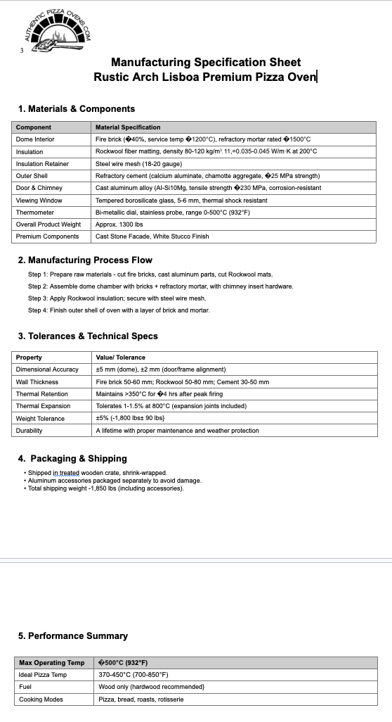 {"id":4490955030588,"title":"RUSTIC ARCH LISBOA PREMIUM PIZZA OVEN","handle":"rustic-arch-lisboa-premium-pizza-oven-brand-new","description":"\u003cdiv style=\"text-align: center;\" class=\"p1\" data-mce-style=\"text-align: center;\"\u003e\n\u003cmeta charset=\"utf-8\"\u003e\n\u003cdiv class=\"p1\" data-mce-style=\"text-align: center;\"\u003e\u003cspan style=\"color: #ff2a00;\" data-mce-style=\"color: #ff2a00;\"\u003e\u003cstrong\u003e\u003c\/strong\u003e\u003c\/span\u003e\u003c\/div\u003e\n\u003c\/div\u003e\n\u003cp class=\"p1\"\u003e \u003c\/p\u003e\n\u003cdiv style=\"text-align: center;\" class=\"p1\" data-mce-style=\"text-align: center;\"\u003e*****WE LOVE THIS RUSTIC BRICK ARCH*****\u003c\/div\u003e\n\u003cp class=\"p1\"\u003eWe love the Lisboa ovens and this RUSTIC BRICK ARCH PREMIUM is an \u003ca href=\"https:\/\/authenticpizzaovens.com\/collections\/traditional\/products\/rustic-arch-lisboa-premium-pizza-oven-brand-new\" target=\"_blank\"\u003eauthentic domed pizza oven\u003c\/a\u003e, and the first model we ever offered. What we love about this oven is the versatility. Not only is it ideal for true Italian-style pizza (in just 90 seconds!), it is also rotisserie capable. The Lisboa has a higher opening than the \u003ca href=\"https:\/\/authenticpizzaovens.com\/collections\/traditional\/products\/pizzaioli-premium-pizza-oven-brand-new\" target=\"_blank\"\u003ePizzaiol\u003c\/a\u003ei's and \u003ca href=\"https:\/\/authenticpizzaovens.com\/collections\/traditional\/products\/ventura-buena-black-premium-pizza-oven-brand-new\" target=\"_blank\"\u003eBuena Ventura models\u003c\/a\u003e, which allows room to fit a spit. It also gives off a strong ambiance as the fire is much more visible, almost like a fire feature or fire pit! The door of this oven is square-shaped and is perfect for pizzas, casseroles, breads and mouth-watering rotisseries. \u003c\/p\u003e\n\u003cp class=\"p1\"\u003e\u003cmeta charset=\"utf-8\"\u003eAll of our ovens are \u003cstrong\u003e\u003ca href=\"https:\/\/authenticpizzaovens.com\/pages\/about-your-oven\"\u003eAUTHENTIC BRICK\u003c\/a\u003e not\u003c\/strong\u003e CLAY! \u003cstrong\u003e \u003cspan style=\"color: #ff2a00;\"\u003eBe careful of this when shopping oven brands- there IS A DIFFERENCE.\u003c\/span\u003e\u003c\/strong\u003e Our ovens are HANDMADE in Portugal and are triple-insulated, which means the outside of the oven is cool to the touch while the inside is blazing hot! Each oven has an inner layer of authentic fire brick and mortar, which is then covered with a thick layer of \u003cstrong\u003eOUR OWN INTERNATIONAL PATENT of Rockwool Insulation\u003c\/strong\u003e that is secured with metal batting before an additional layer of refractory cement. \u003c\/p\u003e\n\u003cp class=\"p1\"\u003e\u003cbr\u003e\u003c\/p\u003e\n\u003cp class=\"p1\"\u003e\u003cb\u003ePremium Hardware:\u003c\/b\u003e The Lisboa has a traditional terracotta BRICK facade with a black \u003cb\u003eNON RUST \u003c\/b\u003eCAST ALUMINUM door, chimney cavity, and STAINLESS STEEL chimney. The door has a peep through high heat viewing window pane.\u003c\/p\u003e\n\u003cp class=\"p1\"\u003e\u003cb\u003eAuthentic Pizza Ovens\u003c\/b\u003e never use a galvanized coating or zinc galvanizing coating on any of their products. You can paint or tile our white domed ovens to match your home or design specifications. You will just need to use a high heat paint or adhesive. We recommend that you first cure your oven and use it for a few weeks and treat it with \u003ca href=\"https:\/\/authenticpizzaovens.com\/collections\/accessories\/products\/ultrafire-crack-repair-kit\" target=\"_blank\"\u003eUltra Fire\u003c\/a\u003e (included) before you paint. \u003c\/p\u003e\n\u003cp class=\"p1\"\u003e\u003cb\u003e Each Oven Package Includes:\u003c\/b\u003e\u003c\/p\u003e\n\u003cul class=\"ul1\"\u003e\n\u003cli class=\"li1\"\u003eCast PREMIUM HIGH-GRADE ALUMINUM DOOR with Stainless Steel Chimney: 6” high spout with flu\/damper (6\"h x 5.5\"w) 38” Pipe extensions and cap available separately.\u003c\/li\u003e\n\u003cli class=\"li1\"\u003e\n\u003cspan class=\"s1\"\u003e\u003c\/span\u003eCeramic Portuguese Baking Dish: (10” x 14.5” x 3”\u003c\/li\u003e\n\u003cli class=\"li1\"\u003e\n\u003cspan class=\"s1\"\u003e\u003c\/span\u003eThermometer: (0-500°C)\u003c\/li\u003e\n\u003cli class=\"li1\"\u003e\n\u003cspan class=\"s1\"\u003e\u003c\/span\u003eUltra Fire: Patch kit to address superficial cracks that will develop (see \u003ca href=\"https:\/\/youtu.be\/3d2Dth9MKmA\"\u003e\u003cspan class=\"s2\"\u003evideo\u003c\/span\u003e\u003c\/a\u003e for more information on how to treat)\u003c\/li\u003e\n\u003c\/ul\u003e\n\u003cp class=\"p1\"\u003e\u003cb\u003eSpecifications:\u003c\/b\u003e\u003c\/p\u003e\n\u003cp class=\"p1\"\u003ePlease note that the door on this model opens from left to right and is split like a barn\/dutch door. Weights \u0026amp; Dimensions Are Not Exact As Each Oven Is Handmade:\u003c\/p\u003e\n\u003cul class=\"ul1\"\u003e\n\u003cli class=\"li1\"\u003e\n\u003cspan class=\"s1\"\u003e\u003c\/span\u003eOUTSIDE: 39\" W x 31” H x 39\" D\u003c\/li\u003e\n\u003cli class=\"li1\"\u003e\n\u003cspan class=\"s1\"\u003e\u003c\/span\u003eINSIDE: 31” W x 19” H x 31” D\u003c\/li\u003e\n\u003cli class=\"li1\"\u003e\n\u003cspan class=\"s1\"\u003e\u003c\/span\u003eDOOR: 15.5” W x 12” H\u003c\/li\u003e\n\u003cli class=\"li1\"\u003e\n\u003cspan class=\"s1\"\u003e\u003c\/span\u003eCHIMNEY: 5.5” W x 6” H\u003c\/li\u003e\n\u003cli class=\"li1\"\u003e\n\u003cspan class=\"s1\"\u003e\u003c\/span\u003eOverall Product Weight: Approx 1300 lbs\u003c\/li\u003e\n\u003c\/ul\u003e\n\u003cmeta charset=\"utf-8\"\u003e\n\u003cp class=\"p1\"\u003e\u003ci\u003eAll of our ovens\u003cspan\u003e \u003c\/span\u003e\u003c\/i\u003e\u003cb\u003e\u003ci\u003erequire\u003c\/i\u003e\u003c\/b\u003e\u003ci\u003e\u003cspan\u003e \u003c\/span\u003e“all-weather” protection from rain, sleet, and snow, fallen leaves, and 